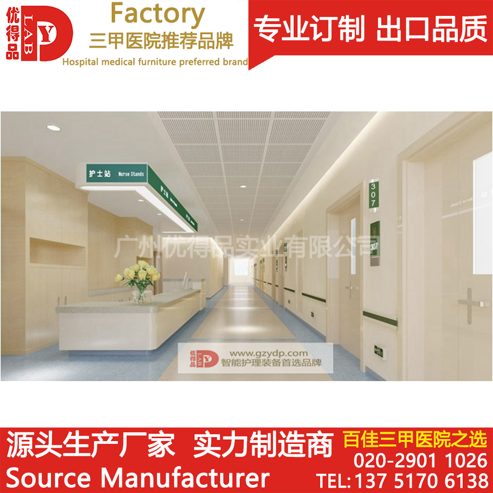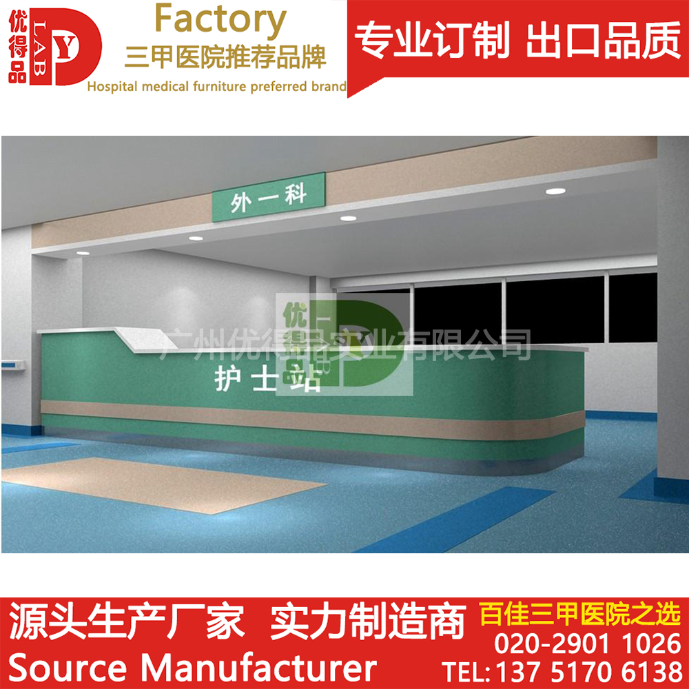 ⑤配置:护士站由三抽柜、主机柜、键盘架、组成。全段设有暗装专用线槽,如:数据线、电源线、电话线等,使用安全,易于检修、清理。