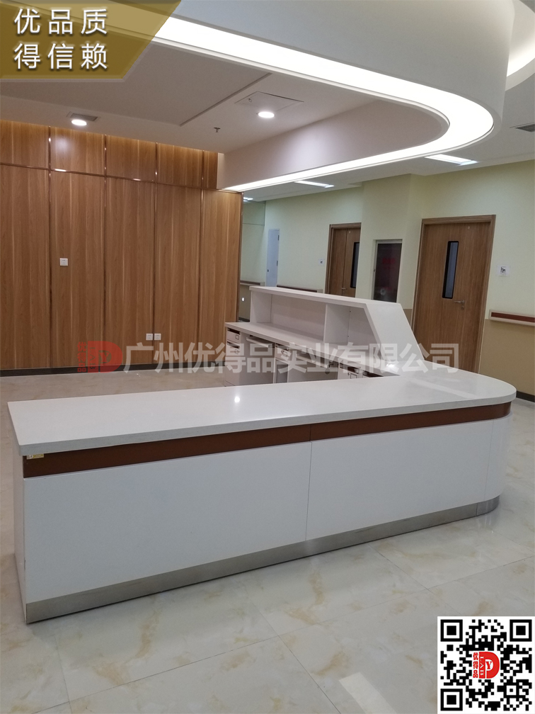 ⑤配置:护士站由三抽柜、主机柜、键盘架、组成。全段设有暗装专用线槽,如:数据线、电源线、电话线等,使用安全,易于检修、清理。